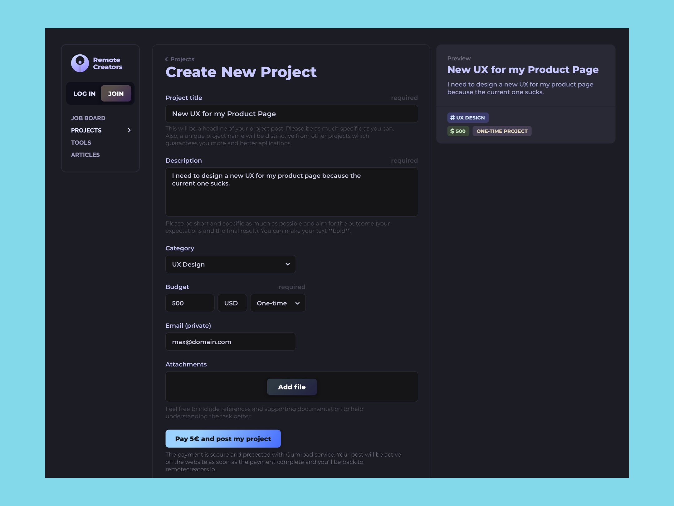 RemoteCreators is an in-house project where everything is created from scratch: idea, design, front-end, back-end, database.