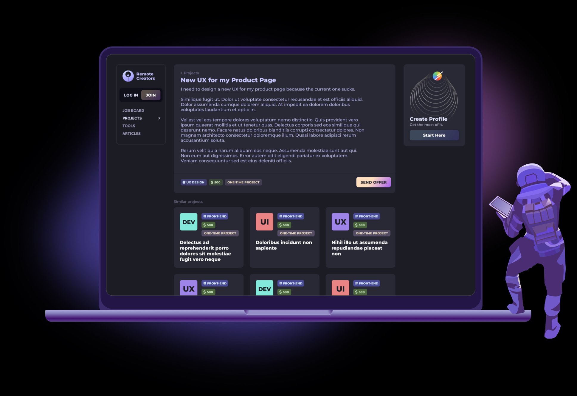 A dark mode screen showcasing a project’s details with clear tags and a prominent CTA to send an offer. The design includes cards with similar projects below, encouraging exploration, and a side widget that allows guests to create a profile, enabling a seamless onboarding experience without interrupting the main workflow. The interface balances clean layouts, intuitive interactions, and responsive design to provide an engaging, user-friendly experience across devices.